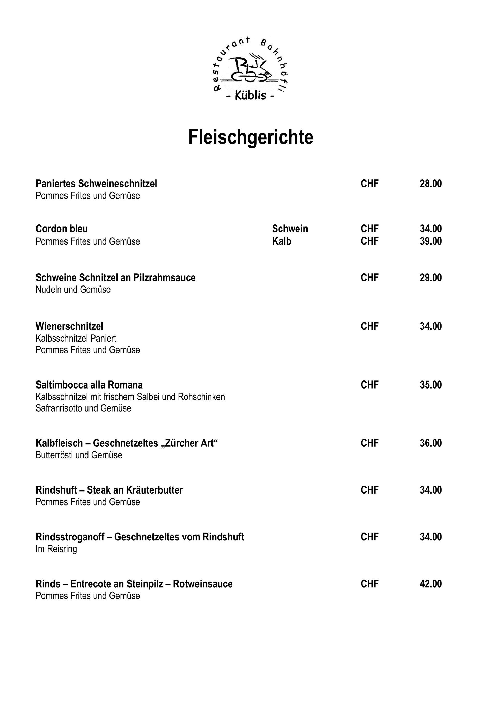 - Kalbfleisch "Zürcher Art", Saltimbocca, Rindsstroganoff, Entrecôte an Rotweinsauce