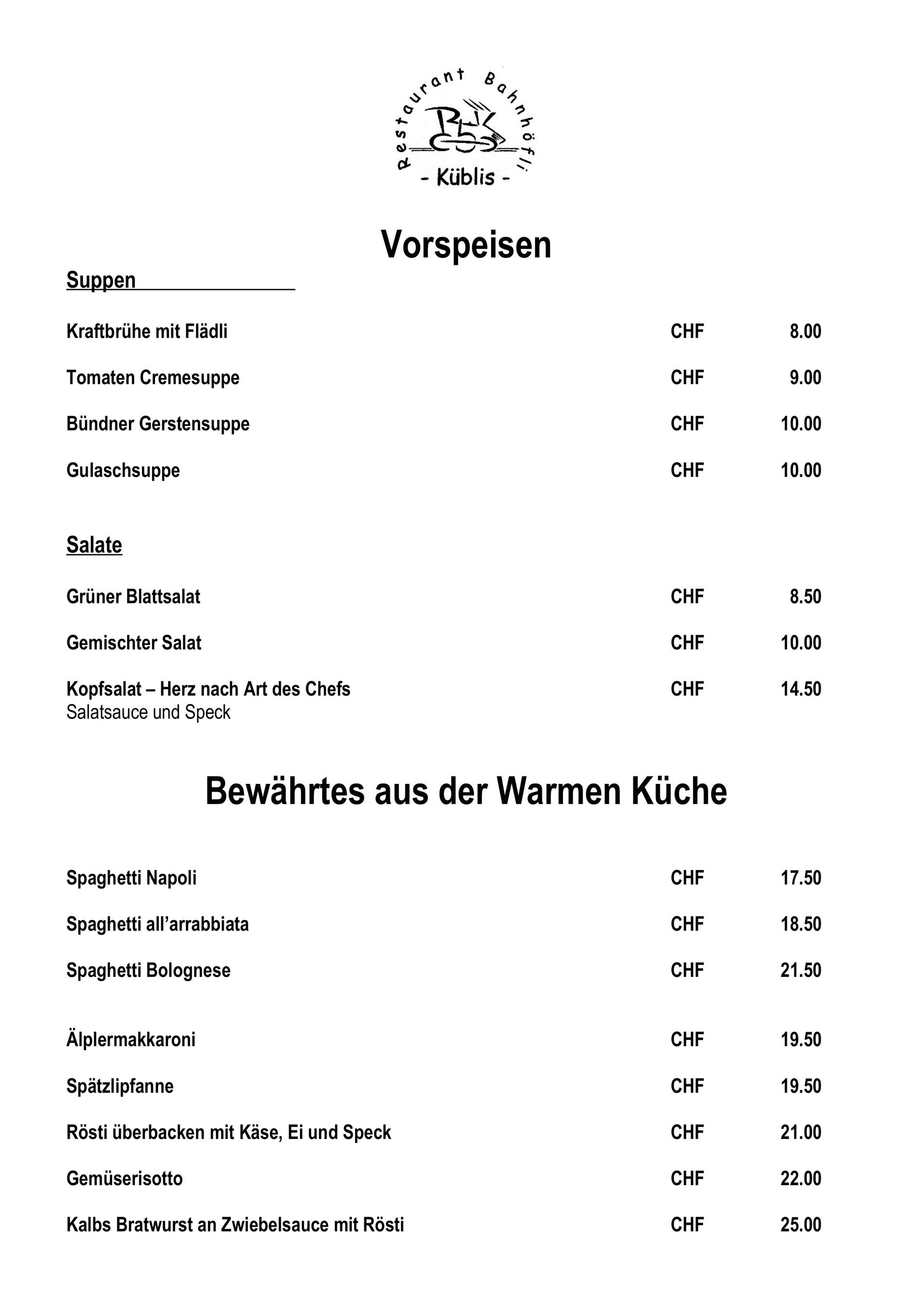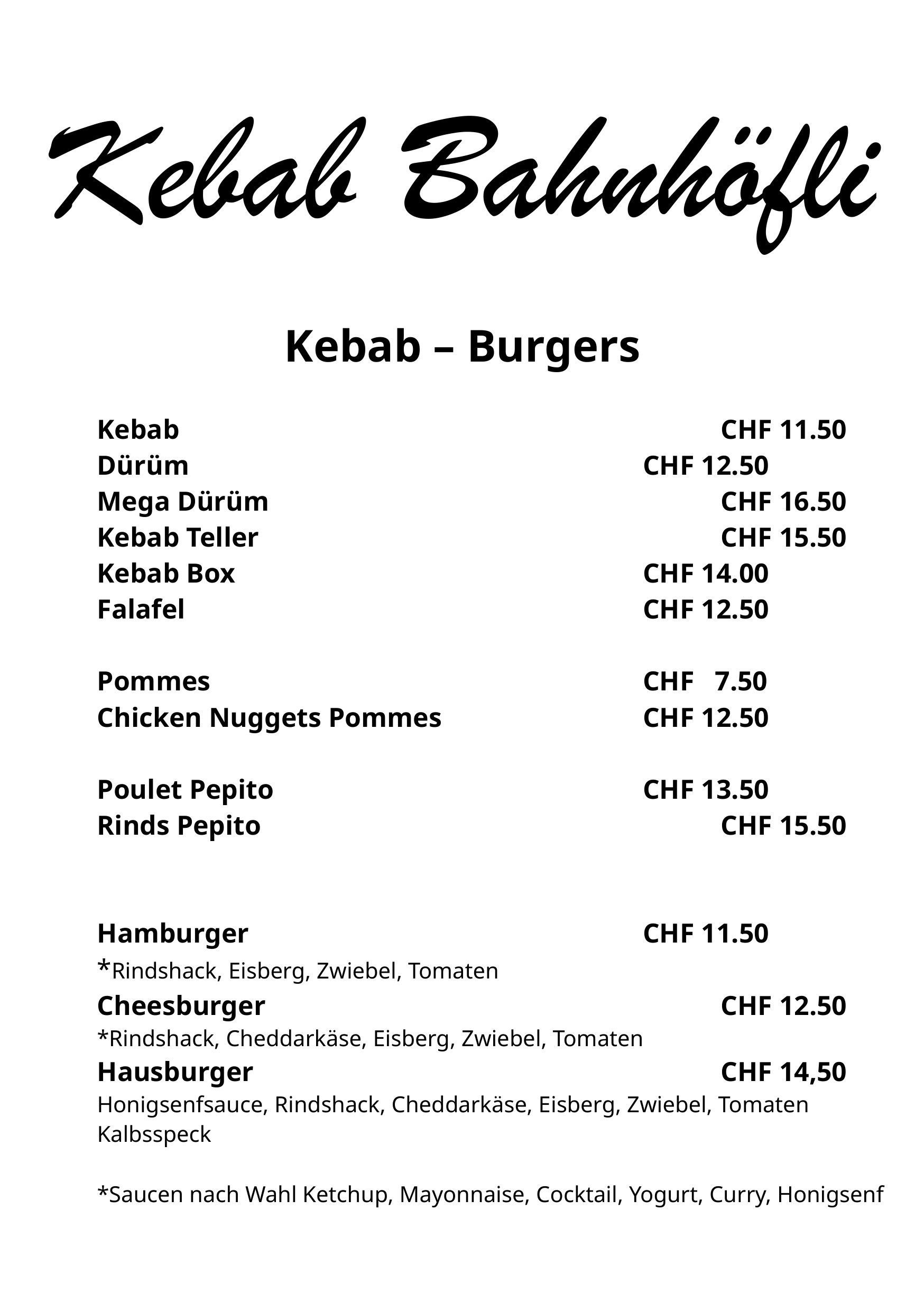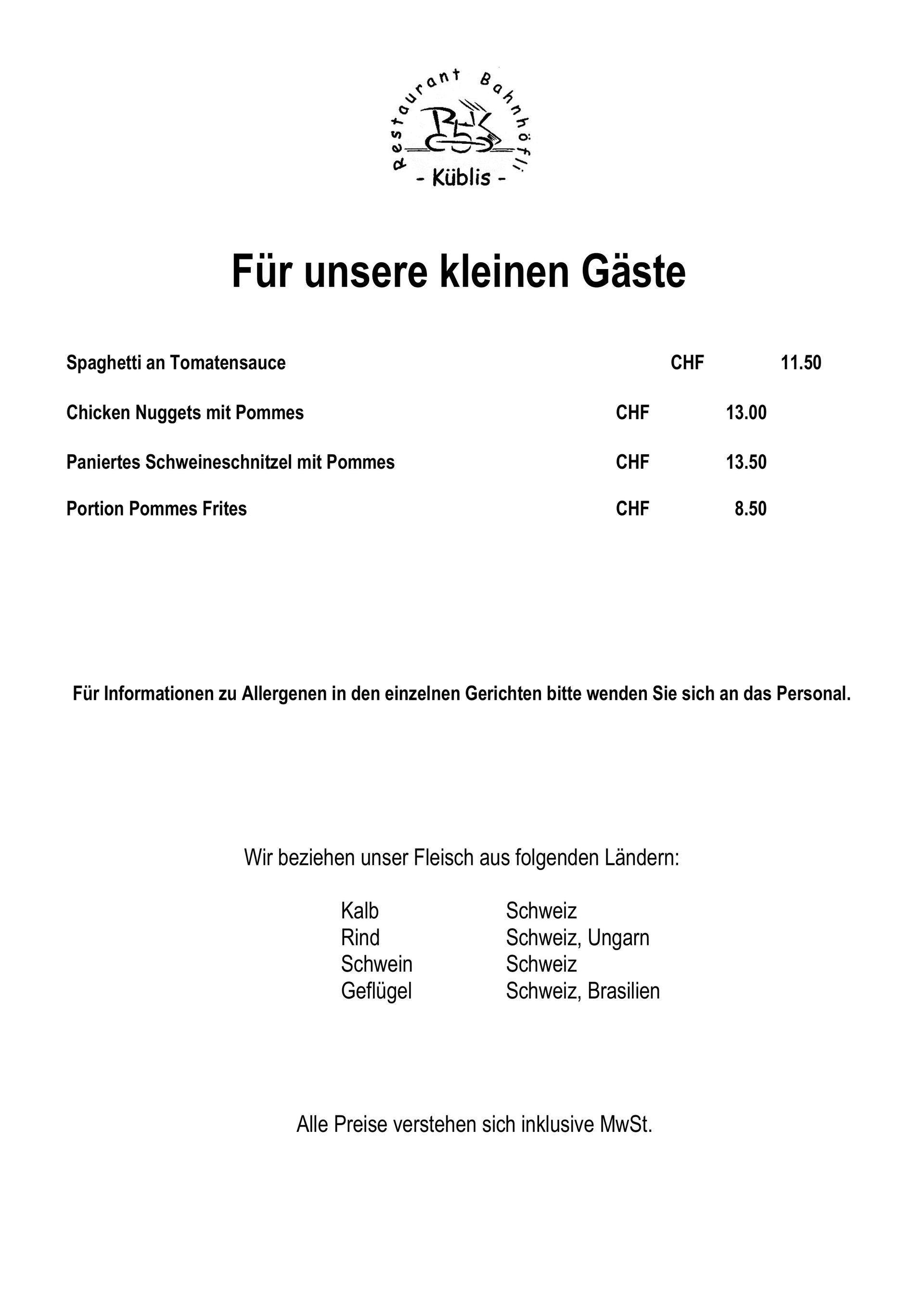 Im Restaurant Bahnhöfli erwartet Sie eine kulinarische Auswahl für jeden Geschmack. Ob traditionelle Schweizer Gerichte, herzhafte Fleischspezialitäten oder unsere neue Kebap-Sektion für den schnellen Genuss zwischendurch – hier wird jeder fündig.