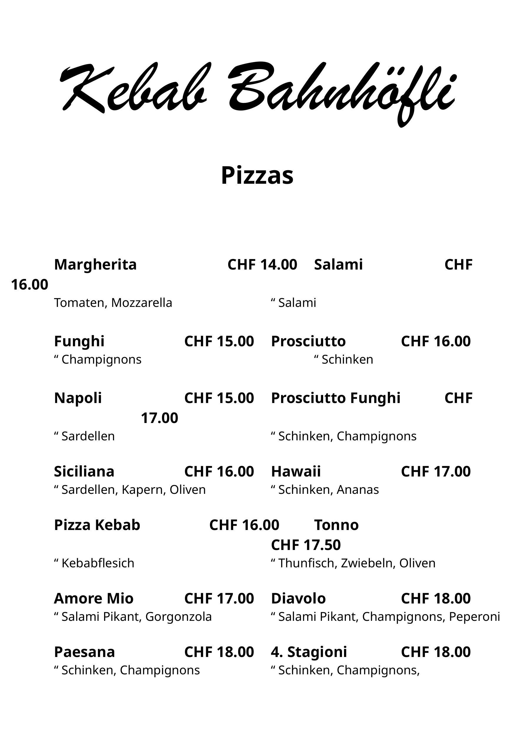 - Margherita, Funghi, Salami, Prosciutto, Kebab, Hawaii, Tonno, Diavolo u.v.m.