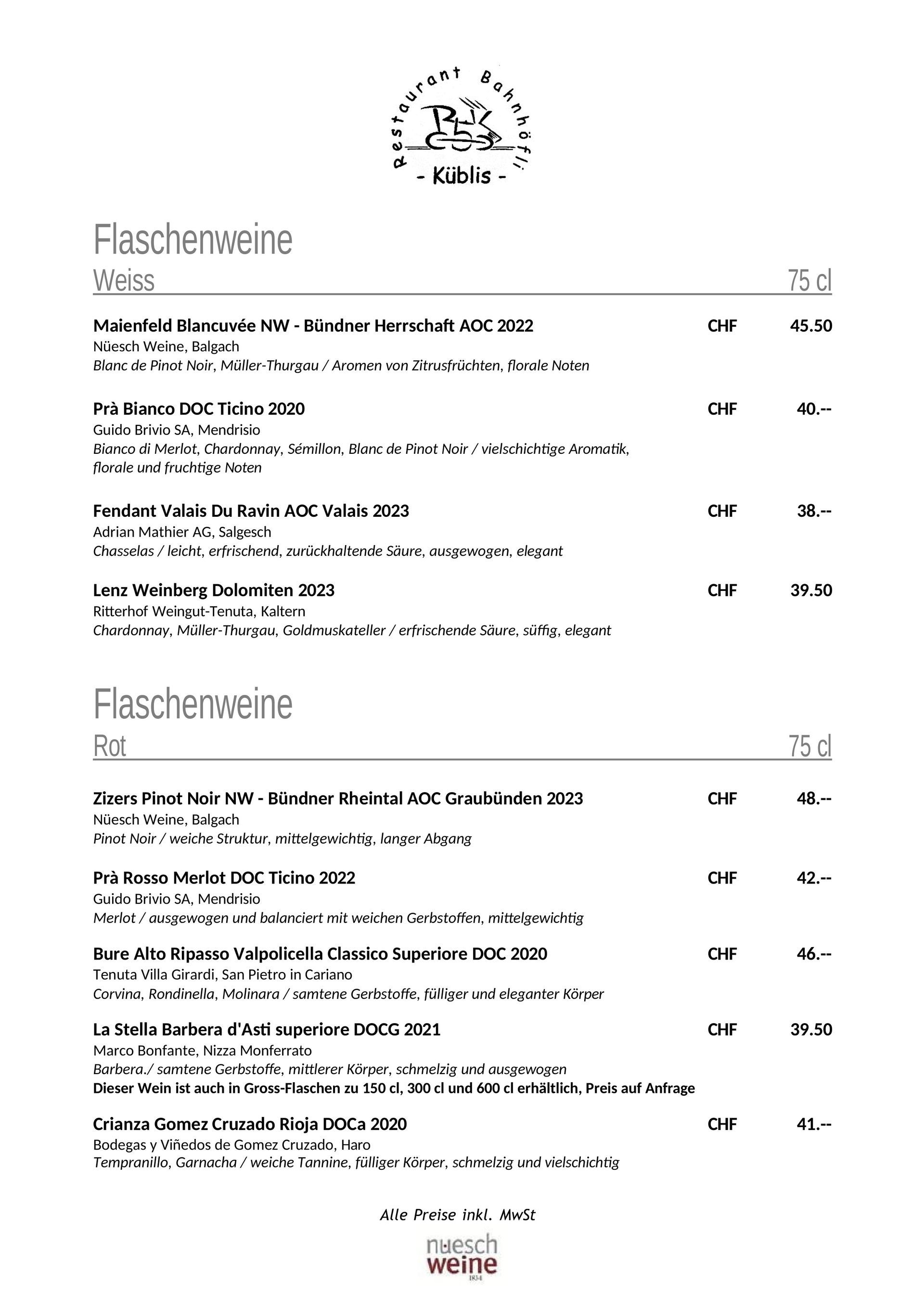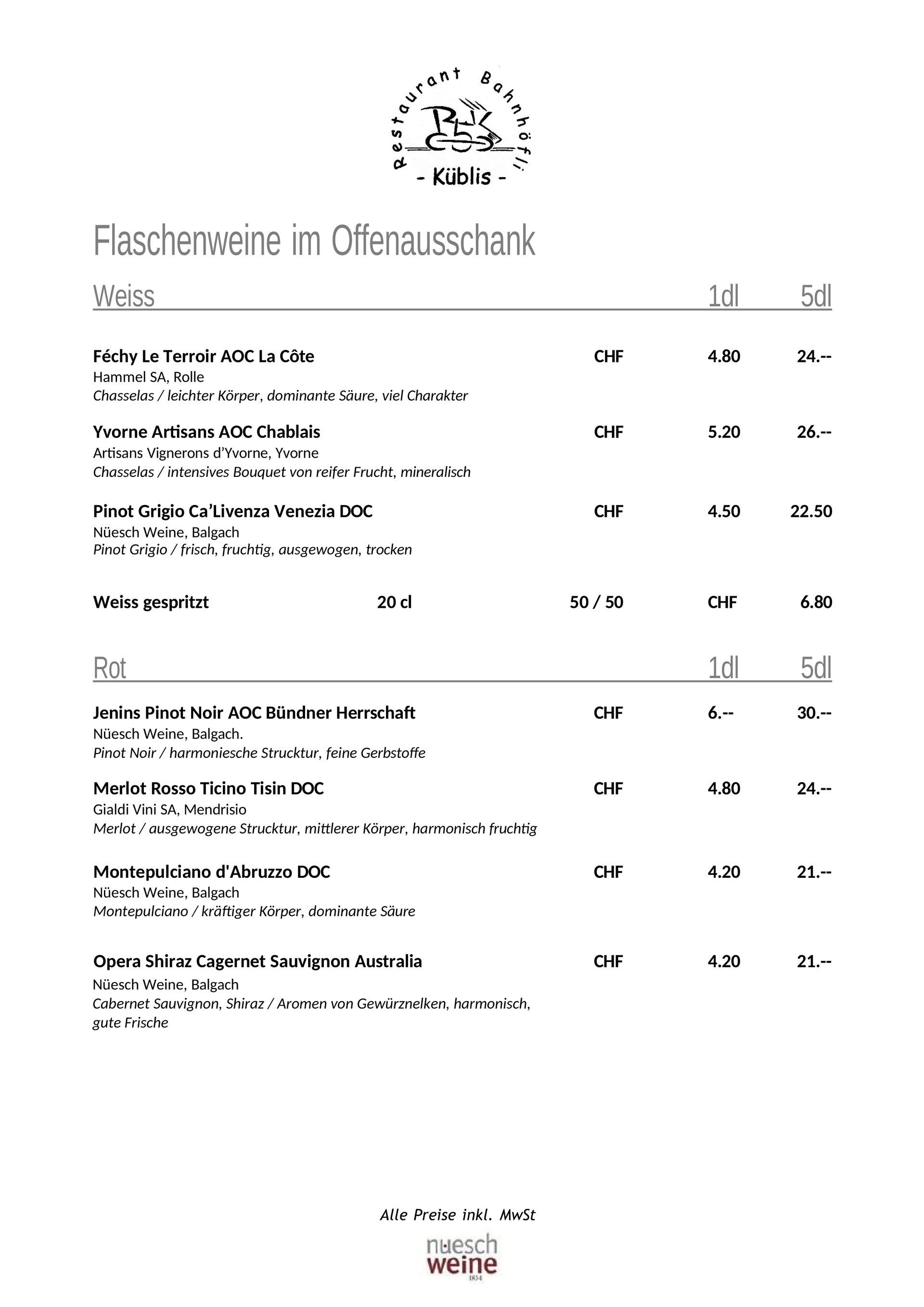 - Féchy Le Terroir, Yvorne, Pinot Grigio, Jenins Pinot Noir, Montepulciano d'Abruzzo